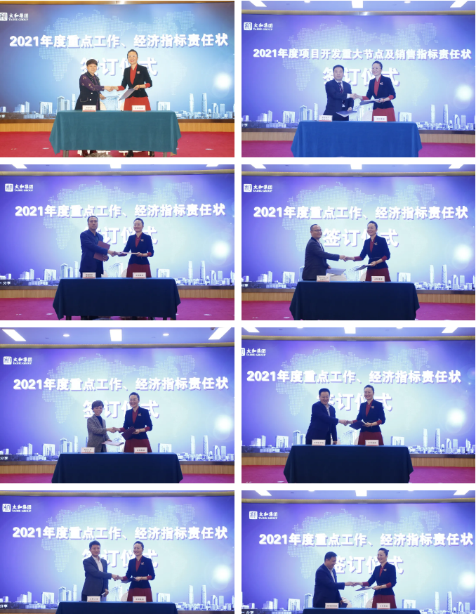 李總工作報(bào)告結(jié)束后,還舉辦了2021年度重點(diǎn)工作、經(jīng)濟(jì)指標(biāo)責(zé)任狀簽訂儀式。李美璇總裁與各企業(yè)負(fù)責(zé)人簽訂2021年度重點(diǎn)工作、經(jīng)濟(jì)指標(biāo)責(zé)任狀。李美璇總裁與各企業(yè)簽訂重點(diǎn)工作、經(jīng)濟(jì)指標(biāo)、項(xiàng)目開發(fā)重大節(jié)點(diǎn)及銷售指標(biāo)責(zé)任狀