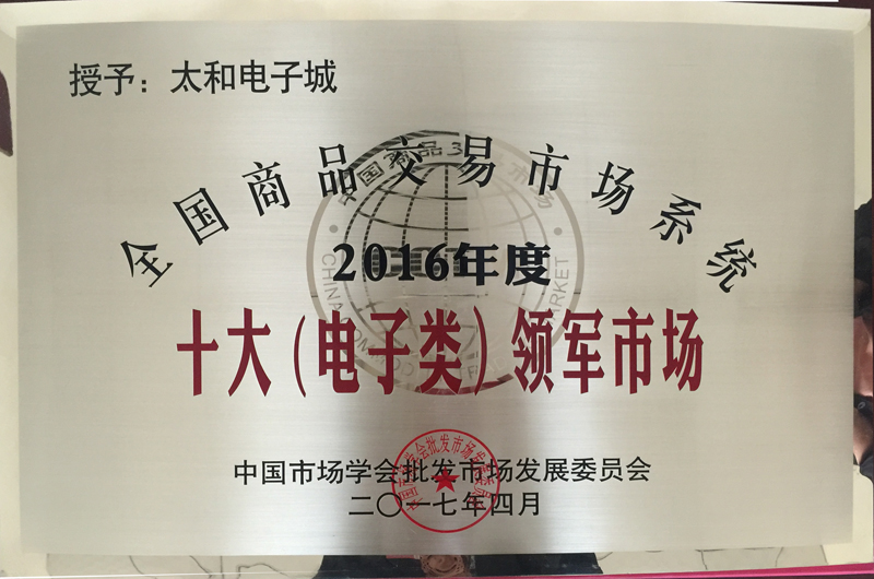 太和電子城榮獲 2016年全國(guó)商品交易市場(chǎng)系統(tǒng)十大電子類領(lǐng)軍市場(chǎng)